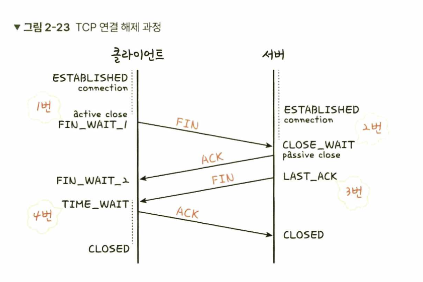 - 4번: 클라이언트는 TIME_WAIT 상태가 되고 다시 서버로 ACK를 보내서 서버는 CLOSED 상태가됩니다. 이후 클라이언트는 어느 정도의 시간을 대기한 후 연결이 닫히고 클라이언트와 서버의 모든 자원의 연결이 해제됩니다.